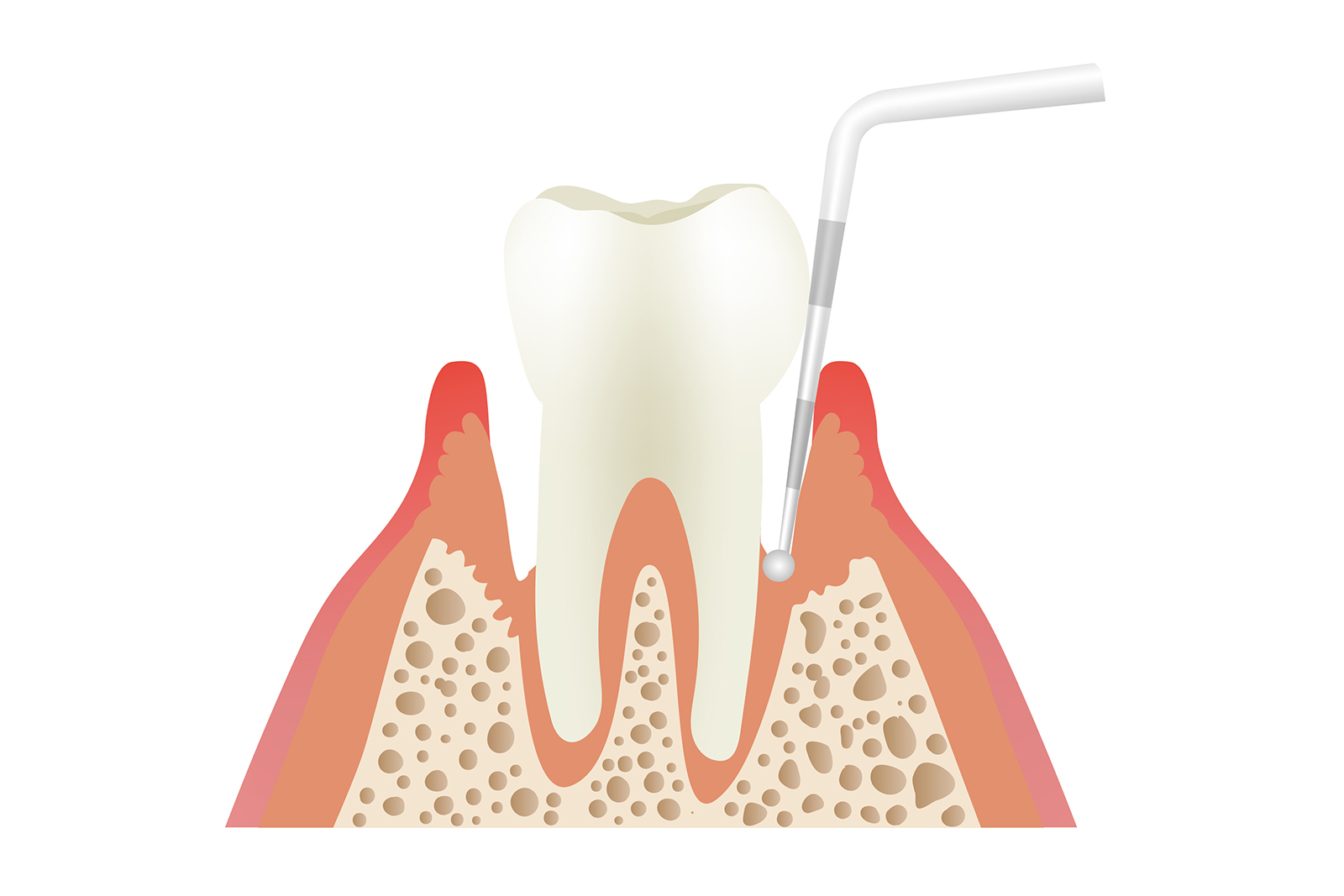 「歯周プローブ」という専用の器具を使い、歯周ポケットの深さを測定します。この検査で得られたデータは、歯周病の進行状況を知るための重要な指標となります。通常、健康な歯ぐきで歯周ポケットの深さは1~2mmです。しかし、3mm以上になると歯周病の可能性があります。