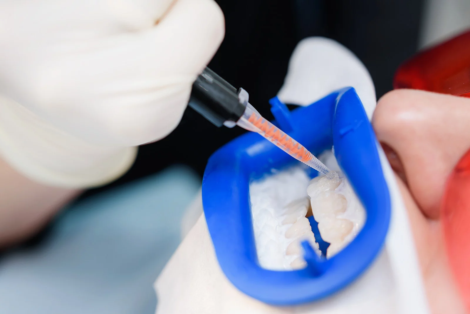 自宅でのホワイトニング治療の開始です。マウスピースにホワイトニング剤を注入し、装着してください。1日2時間程度を目安に、約2週間続けます。